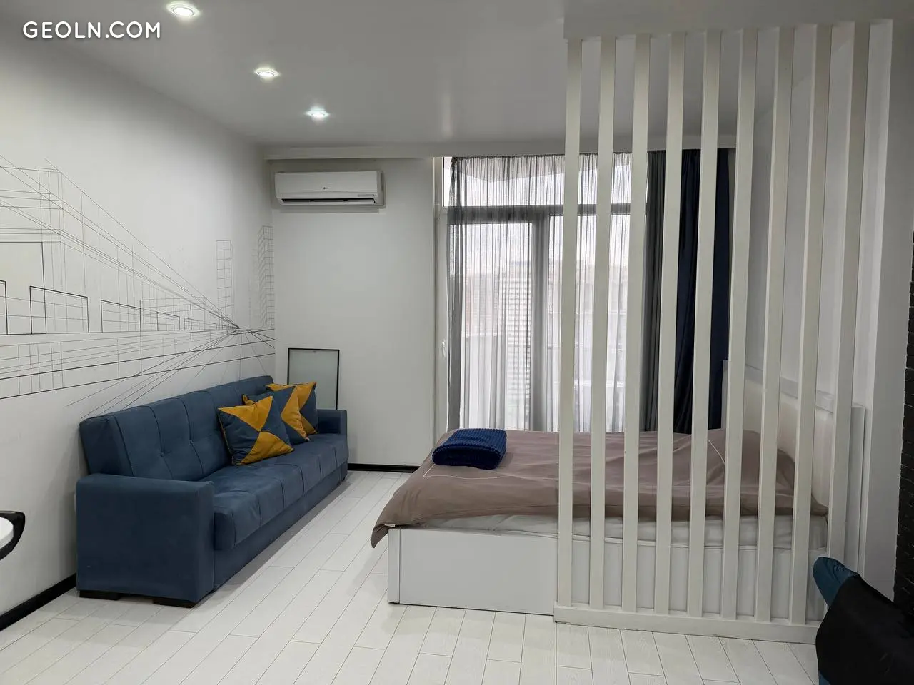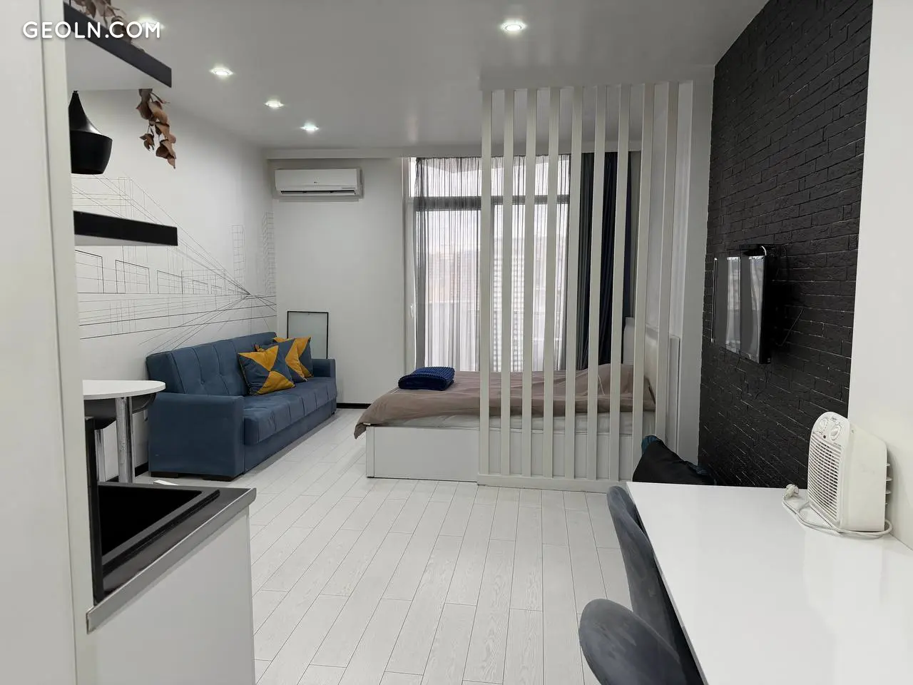 Просторная студия с диваном и рабочим столом.